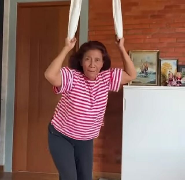 Susi kemudian menunjukkan caranya. Dengan tangan berpegang pada kain, ia kemudian berputar-putar.