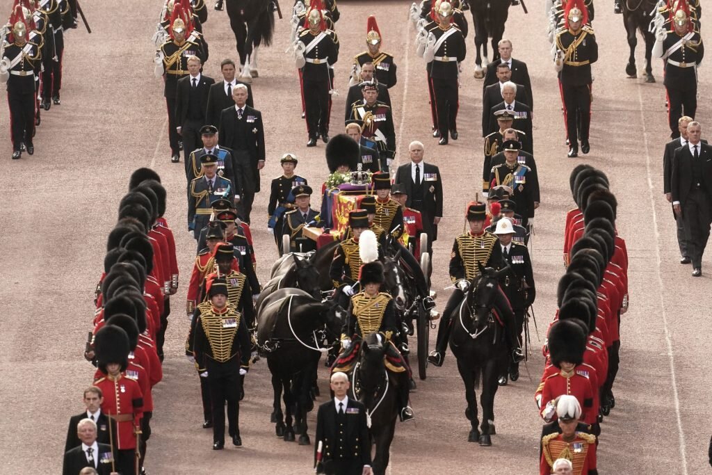 Raja Charles III, penerus Ratu, bersama kedua putranya – Pangeran William dan Pangean Harry – serta para anggota keluarga kerajaan lain berjalan di belakang kereta yang membawa peti jenazah.