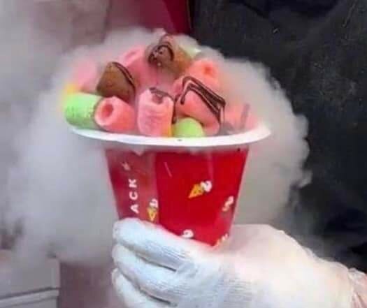 Dari wadah plastik chiki sebesar cangkir minum itulah sang es kering bereaksi dengan udara yang lebih hangat di sekitarnya sehingga menimbulkan ‘asap tapi tak panas’ yg sungguh sensasional. Dalam tayangan televisi bahkan orang dewasa tampak tersenyum-senyum menikmati sensasi asapnya.