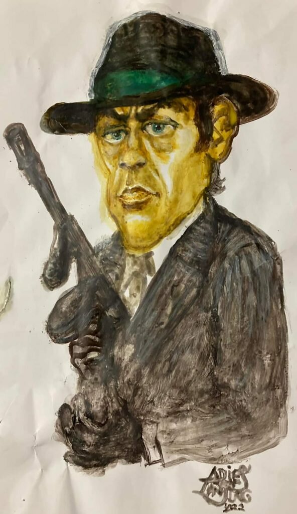 Ilustrasi: Karikatur Alain Delon, baru saja beberapa menit lalu aku orat-oret dengan akrilik di atas kertas bekas kalender. Tapi.. lhooo, kok malah mirip Dicky Zulkarnain. Ini Borsalino atau “Si Pitung”…?